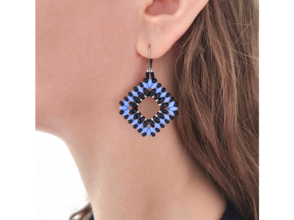 Barva: Tato varianta kombinuje něžně modré a černé korálky. Celek doplňují drobné stříbrné korálky a náušnicové háčky ve stejné barvě.