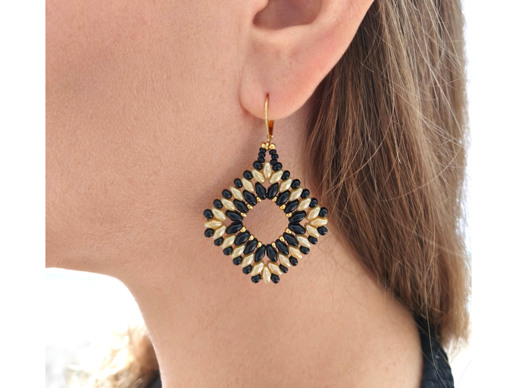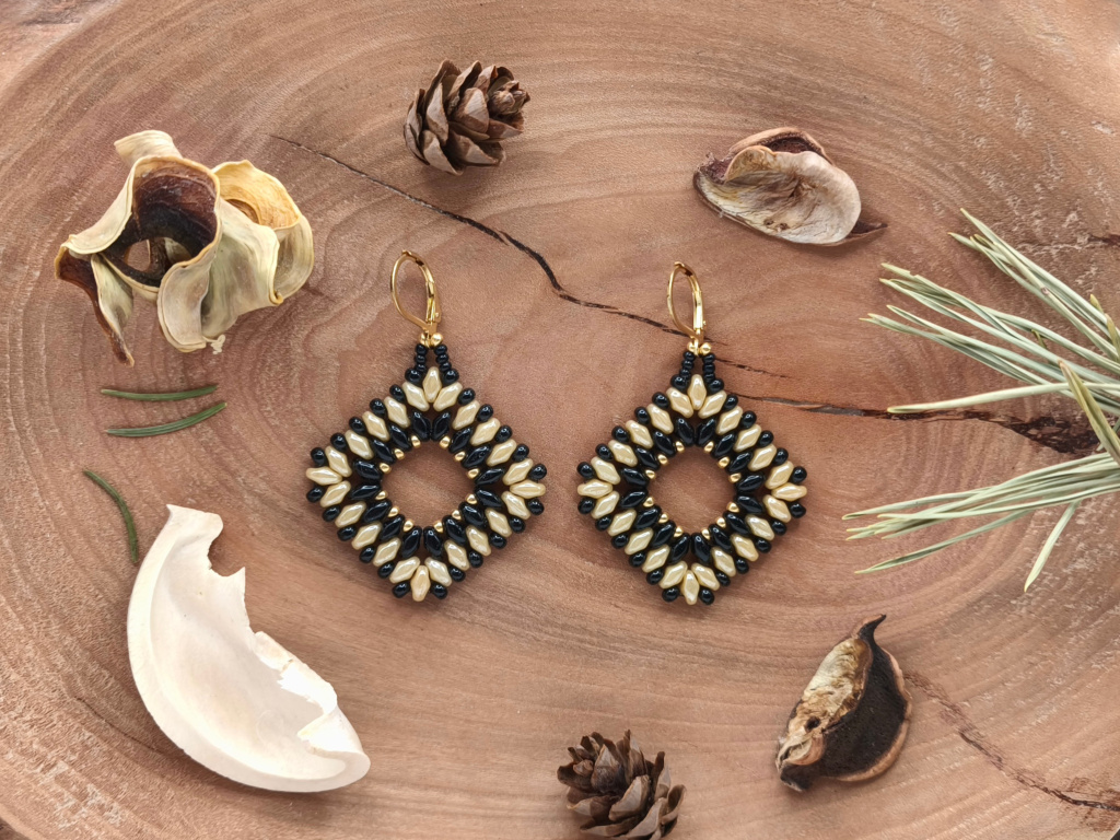 Barva: Tato varianta kombinuje korálky krémové a černé barvy. Celek doplňují drobné zlaté korálky a náušnicové háčky ve stejné barvě.