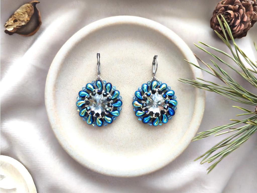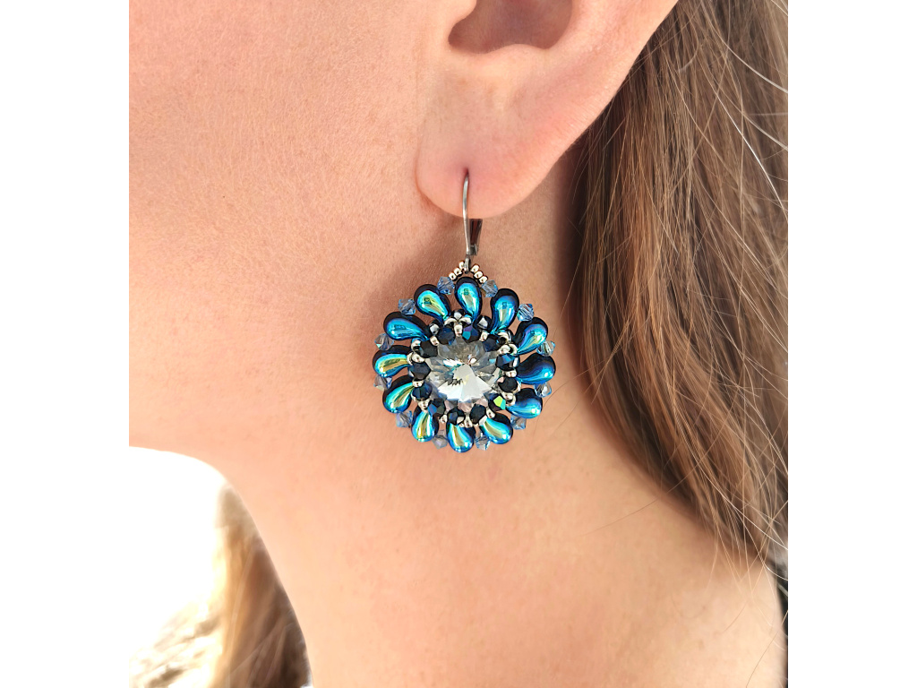 Barva: Tato varianta obsahuje výrazné korálky s duhovými odlesky v modrých, zelených a zlatých tónech, které připomínají vesmír. Ve středu se nachází broušený třpytivý skleněný kamínek v křišťálové barvě. Celek doplňují menší černé a světle modré korálky spolu s drobnými stříbrnými korálky a náušnicovými háčky ve stejné barvě.