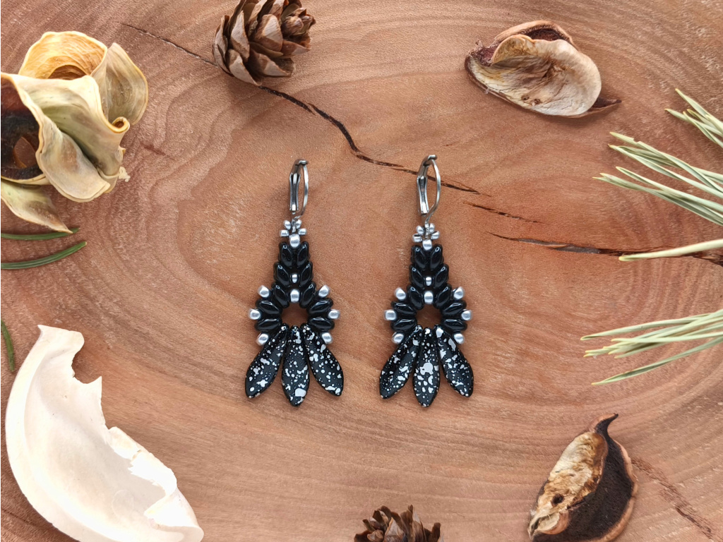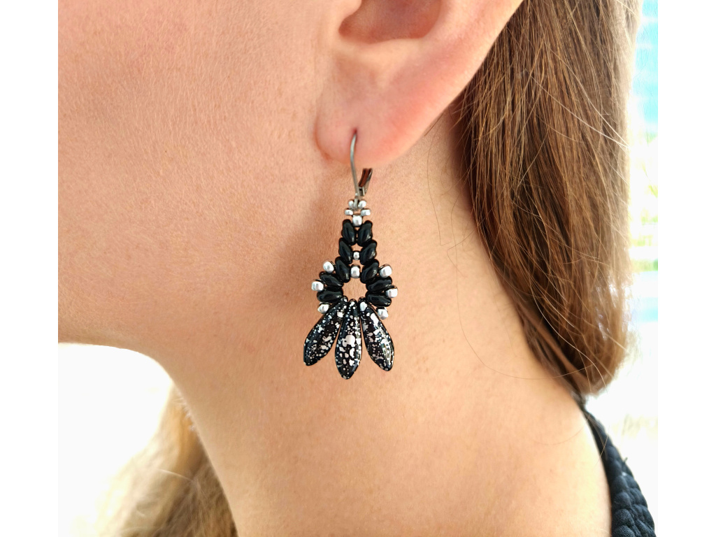 Barva: Tato varianta spojuje černé korálky s výraznými korálky s černým základem a kontrastními stříbrnými skvrnami. Celek doplňují drobné stříbrné korálky a náušnicové háčky ve stejné barvě.