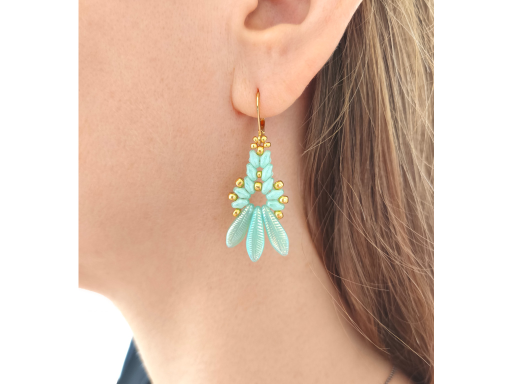 Barva: Tato varianta spojuje mátově zelené korálky s výraznými korálky s motivem listu ve stejném odstínu. Celek doplňují drobné zlaté korálky a náušnicové háčky ve stejné barvě.