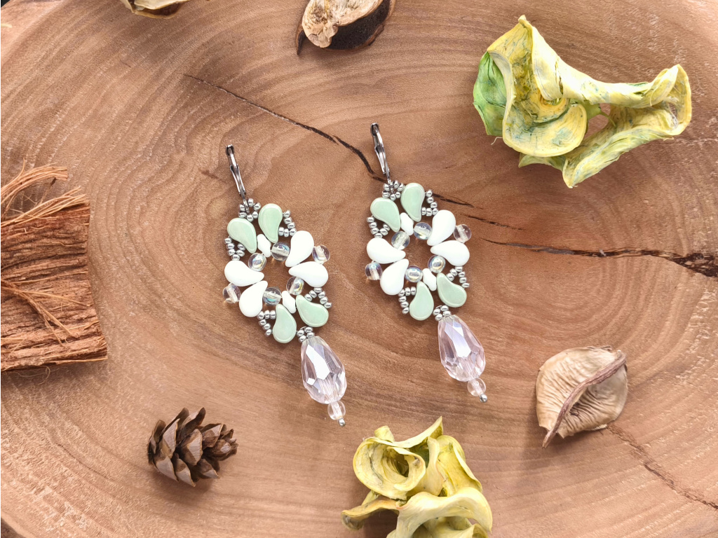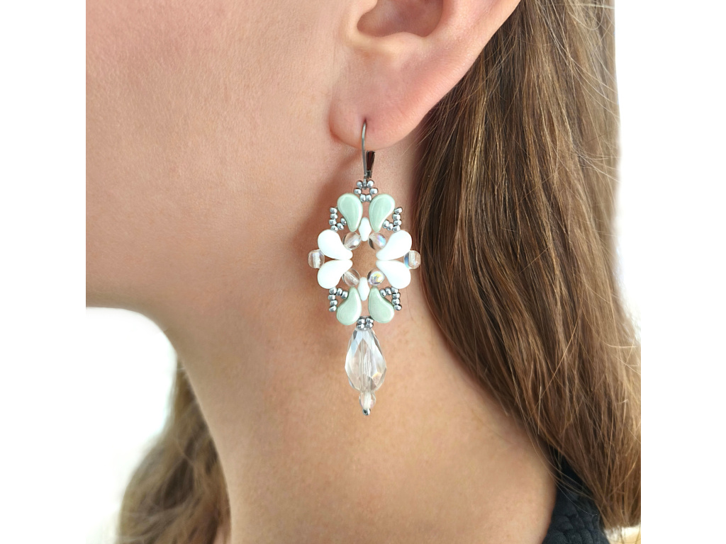 Barva: Tato varianta kombinuje bílé, mátově zelené a třpytivé korálky v křišťálové barvě. Celek doplňují drobné stříbrné korálky a náušnicové háčky ve stejné barvě.