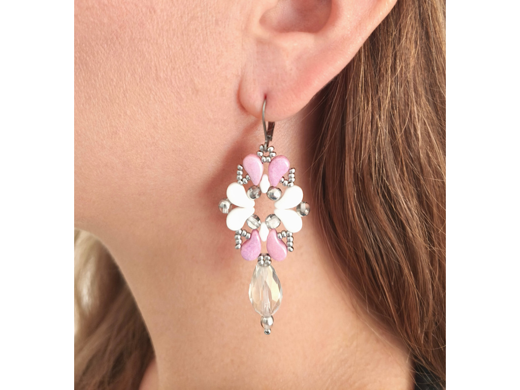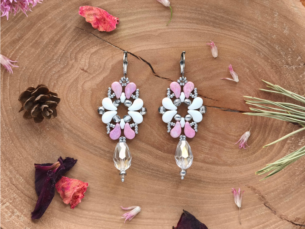 Barva: Tato varianta kombinuje korálky bílé, růžové a křišťálově-stříbrné barvy. Celek doplňují drobné stříbrné korálky a náušnicové háčky ve stejné barvě.