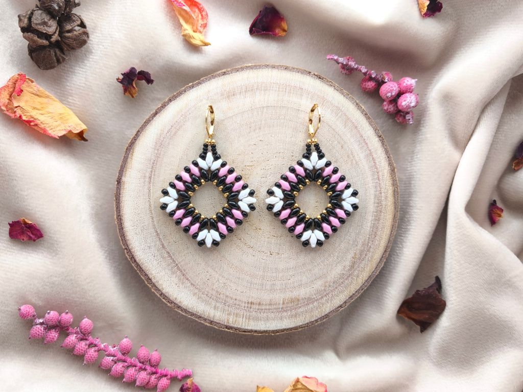 Náušnice jsou ručně šité z kvalitních skleněných korálků a mají praktické zavírací háčky z hypoalergenní nerezové oceli pozlacené 24k zlatem.