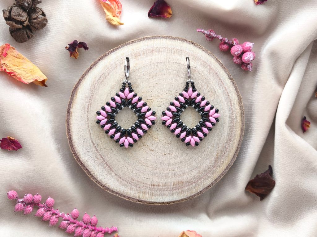 Náušnice jsou ručně šité z kvalitních skleněných korálků a mají praktické zavírací háčky z hypoalergenní nerezové oceli.