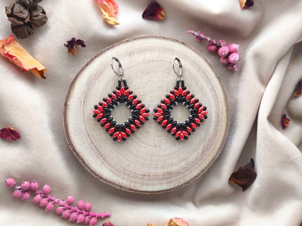 Náušnice jsou ručně šité z kvalitních skleněných korálků a mají praktické zavírací háčky z hypoalergenní nerezové oceli.