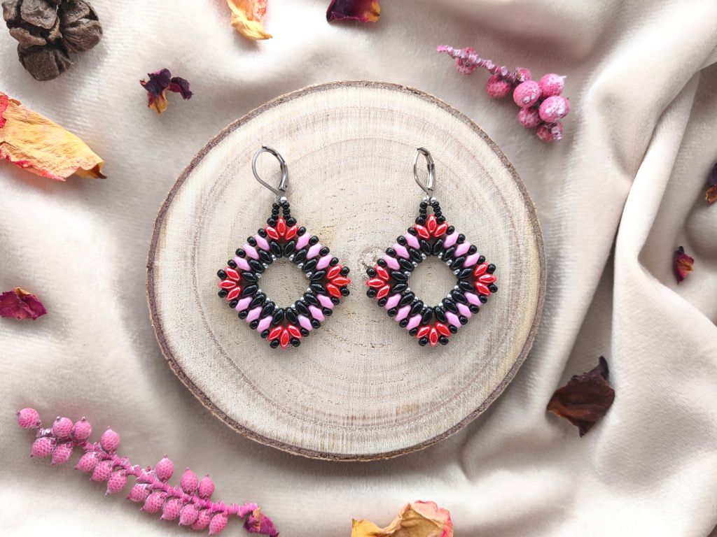 Náušnice jsou ručně šité z kvalitních skleněných korálků a mají praktické zavírací háčky z hypoalergenní nerezové oceli.