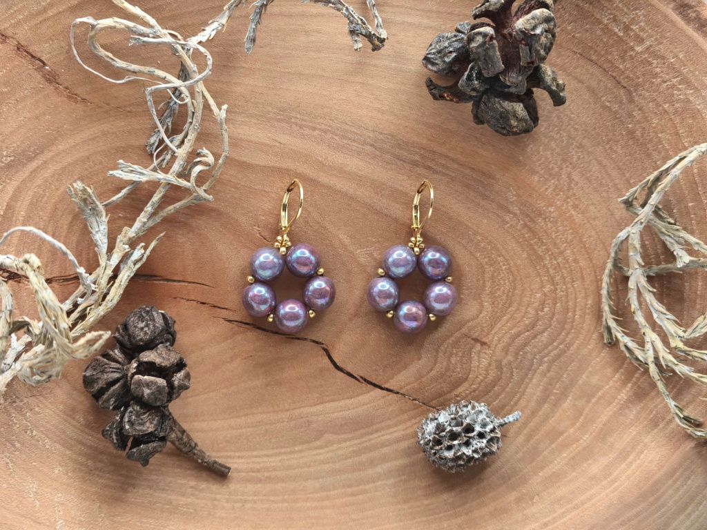 Tato varianta kombinuje fialovo-růžové korálky s drobnými zlatými korálky a náušnicovými háčky ve stejné barvě.
