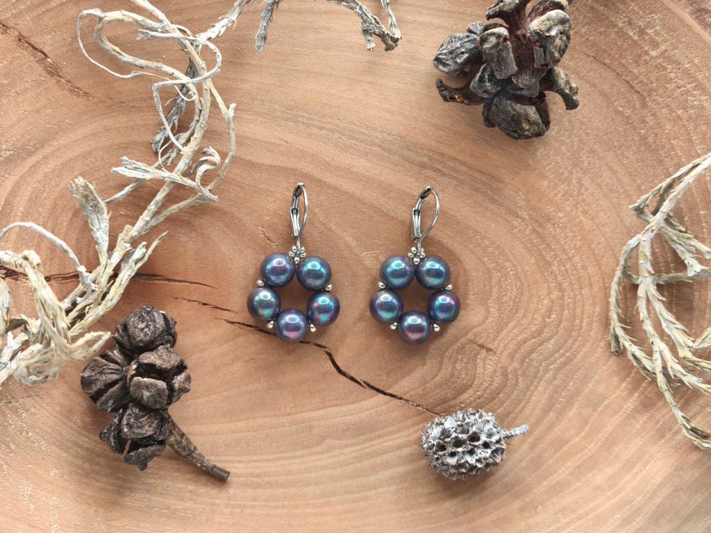 Tato varianta kombinuje tmavě fialové korálky s modravými odlesky a drobné stříbrné korálky. Náušnicové háčky jsou také ve stříbrné barvě.