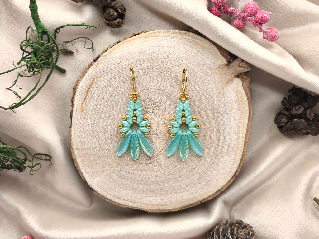 Celek doplňují drobné zlaté korálky a náušnicové háčky ve stejné barvě.